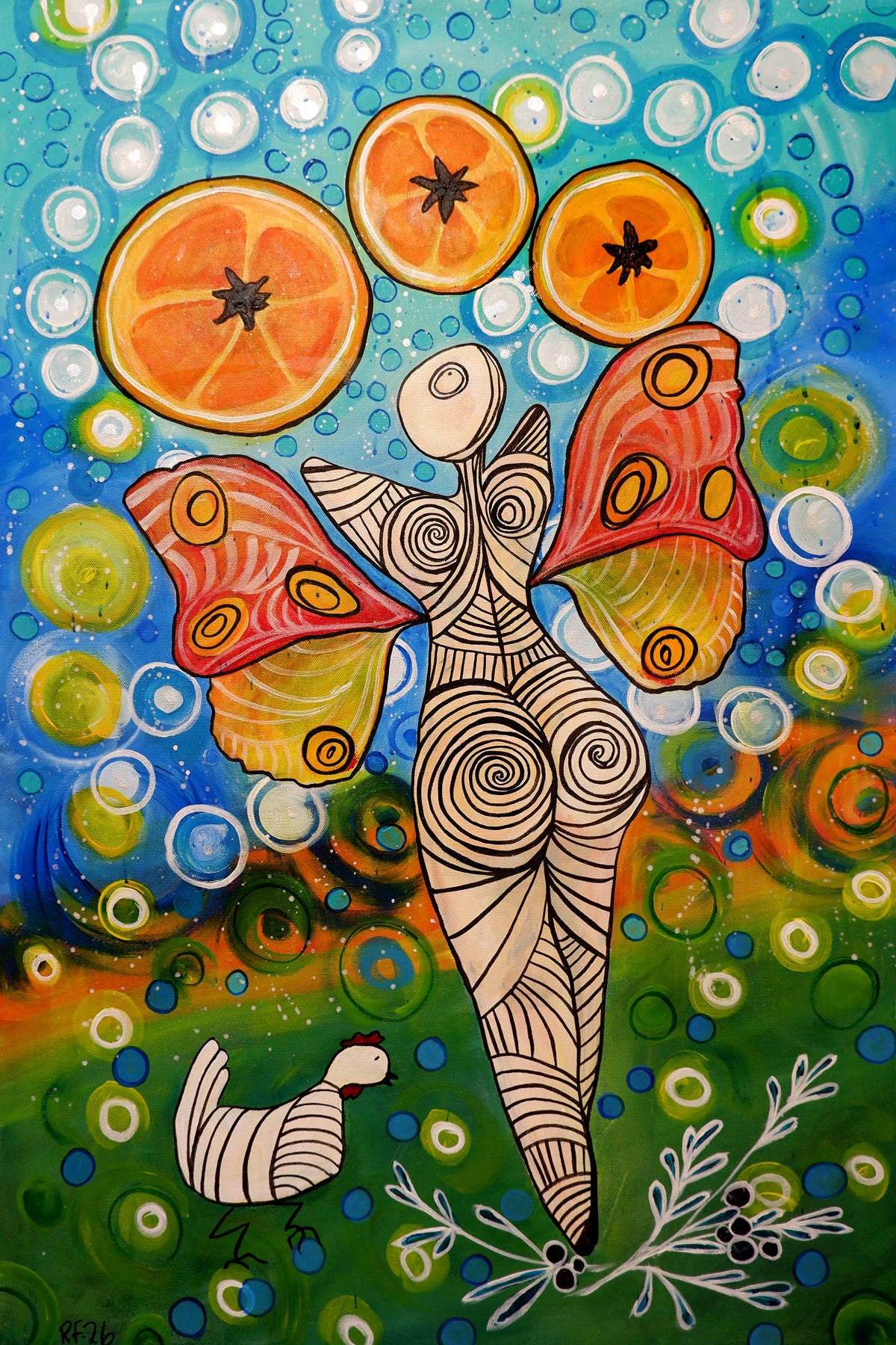 All of my ancestor paintings tell ancient Slavic folk tales using female forms from the Neolithic. The statuette on which my Kikimora is based is from the Cucuteni culture in what is now northeastern Romania. The painting is acrylic & ink on 24x26” canvas.